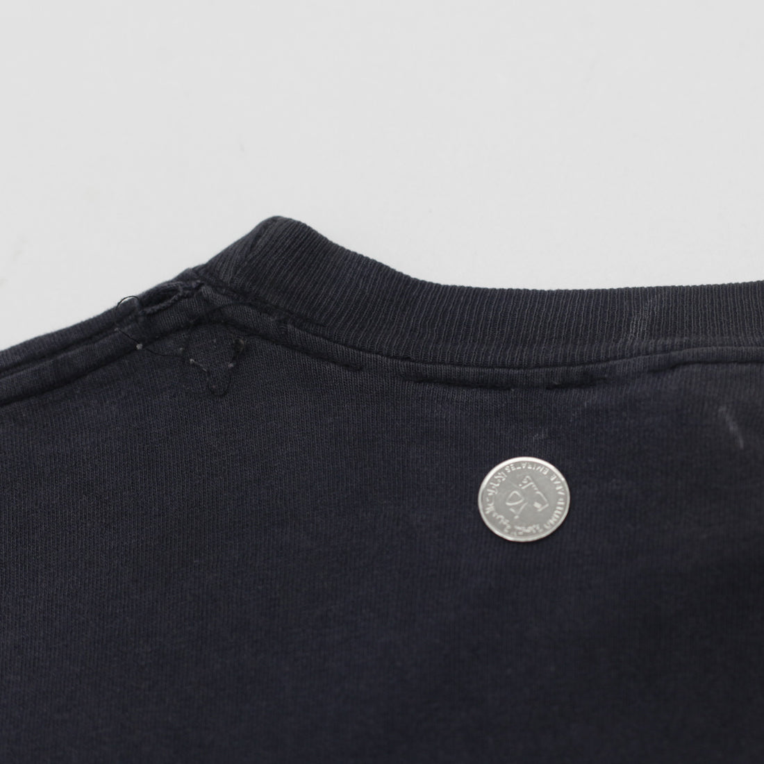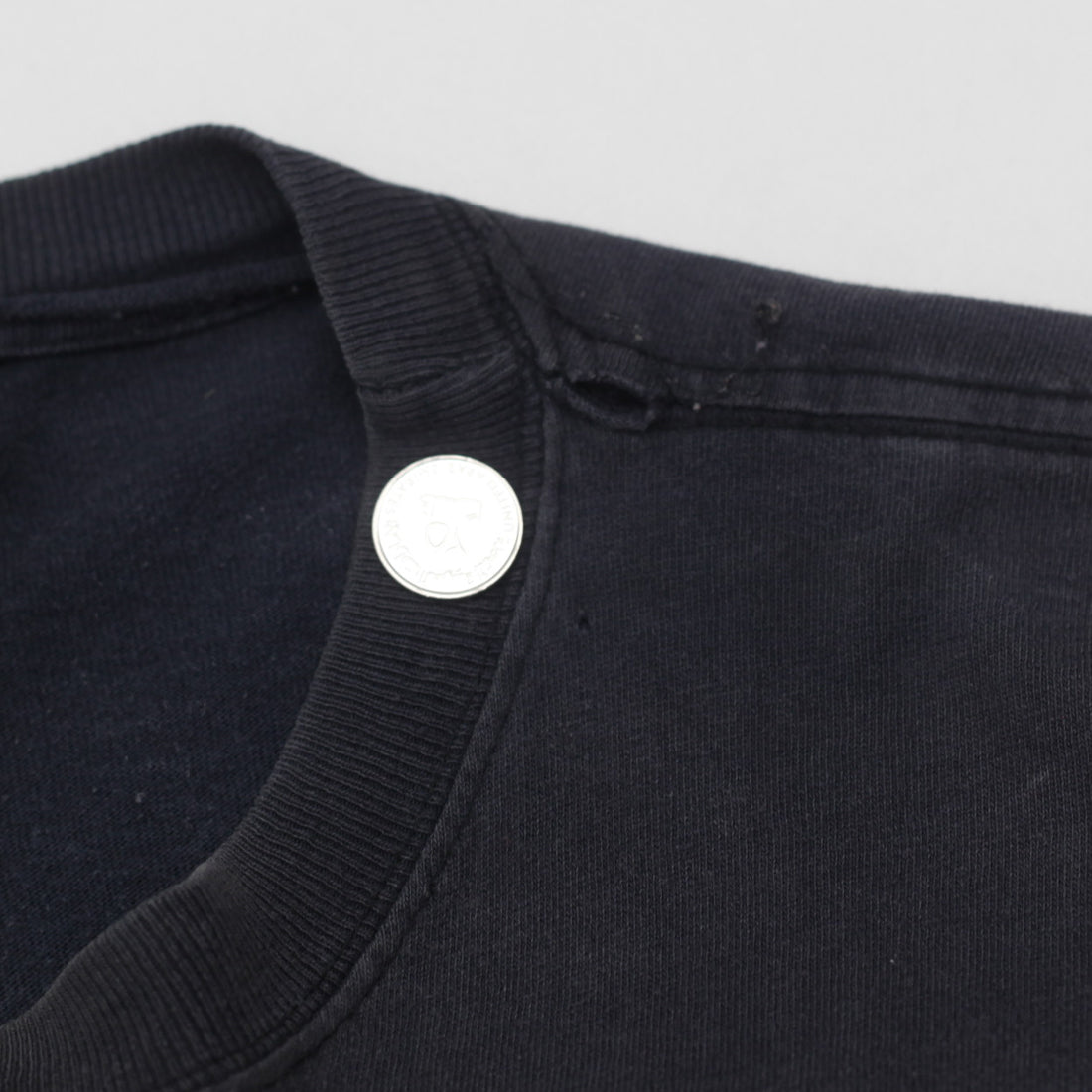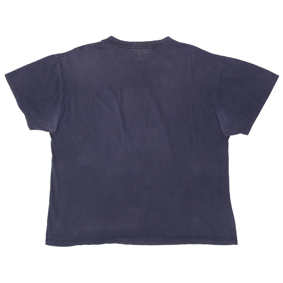 Distressed neck. Small hole on bottom. Minor discoloration. Minor cracked on print. Pulled out thread on neck
