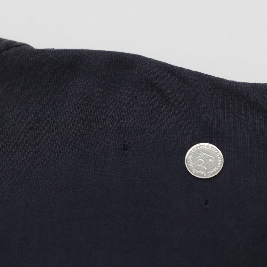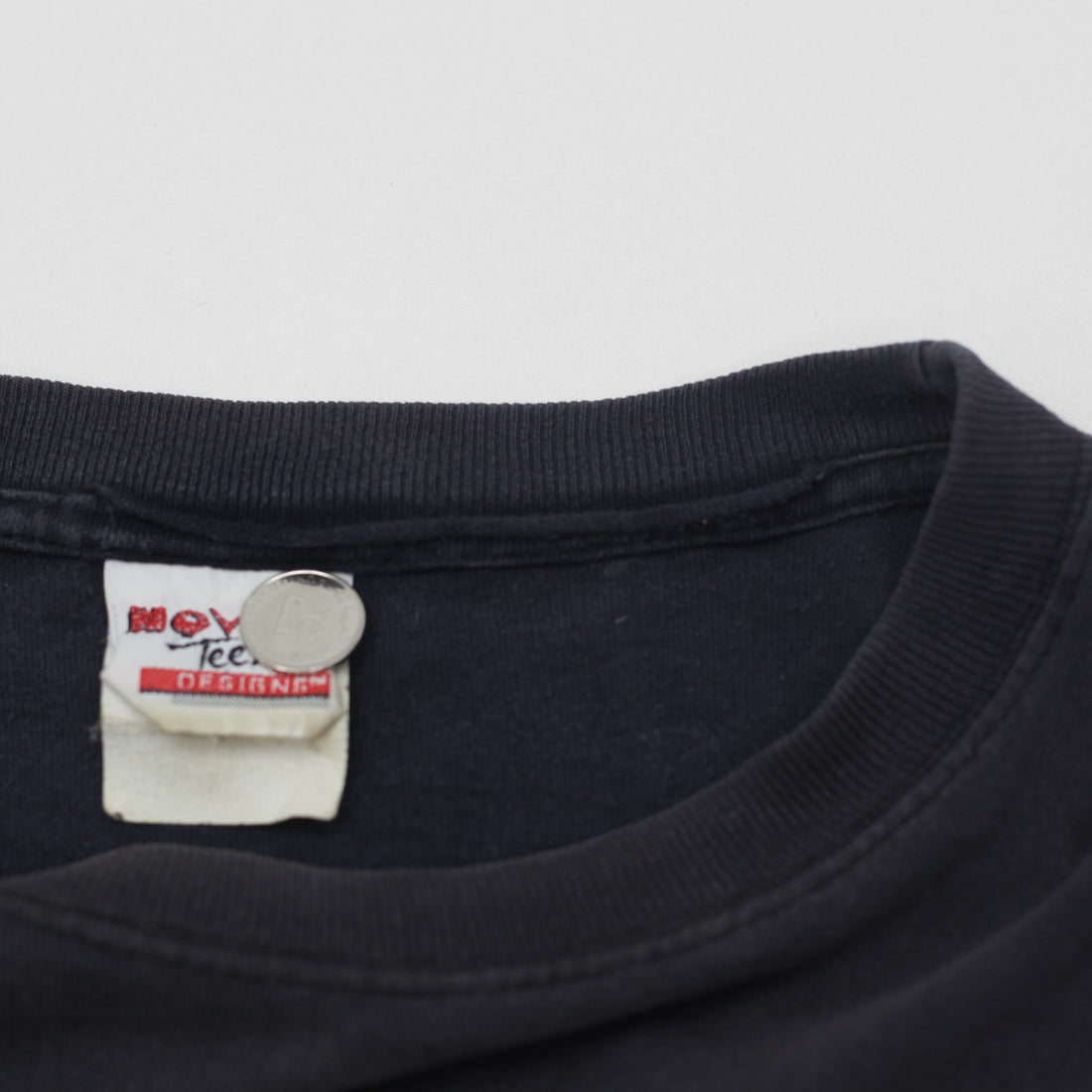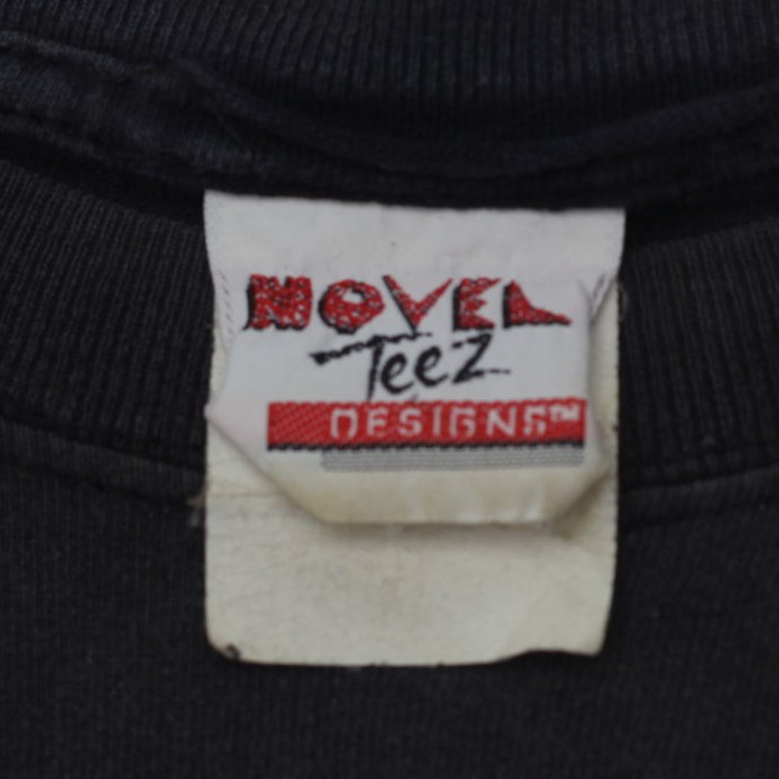 Distressed neck. Small hole on bottom. Minor discoloration. Minor cracked on print. Pulled out thread on neck