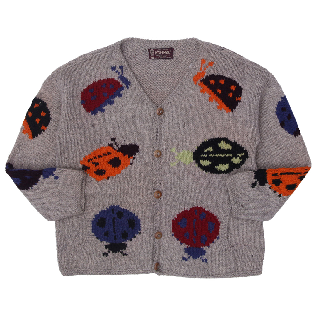 Vintage ISHKA Ladybug Cardigan Hand-Knitted One Size Fits All 100% Wool Sweater