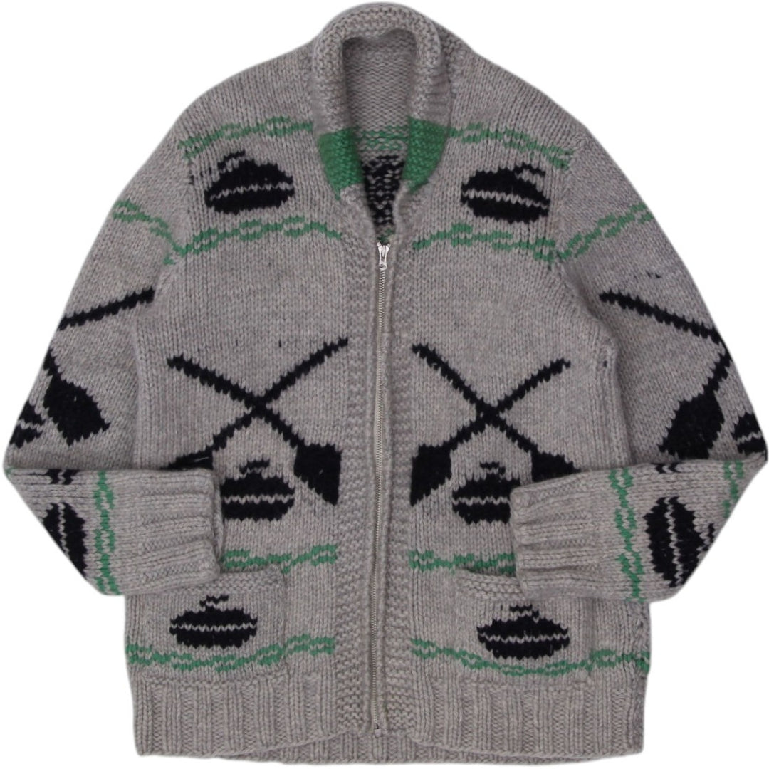 Vintage Hand-Knitted Cowichan-Style Wool Zip Up Cardigan Sweater