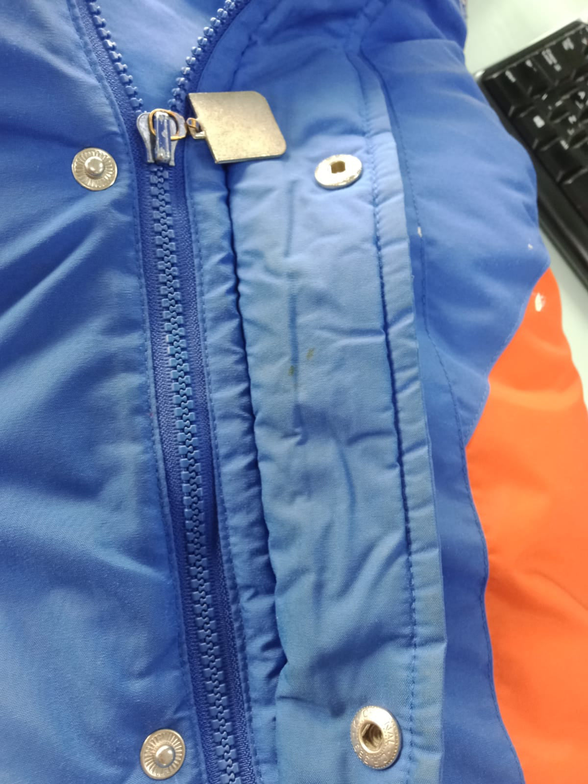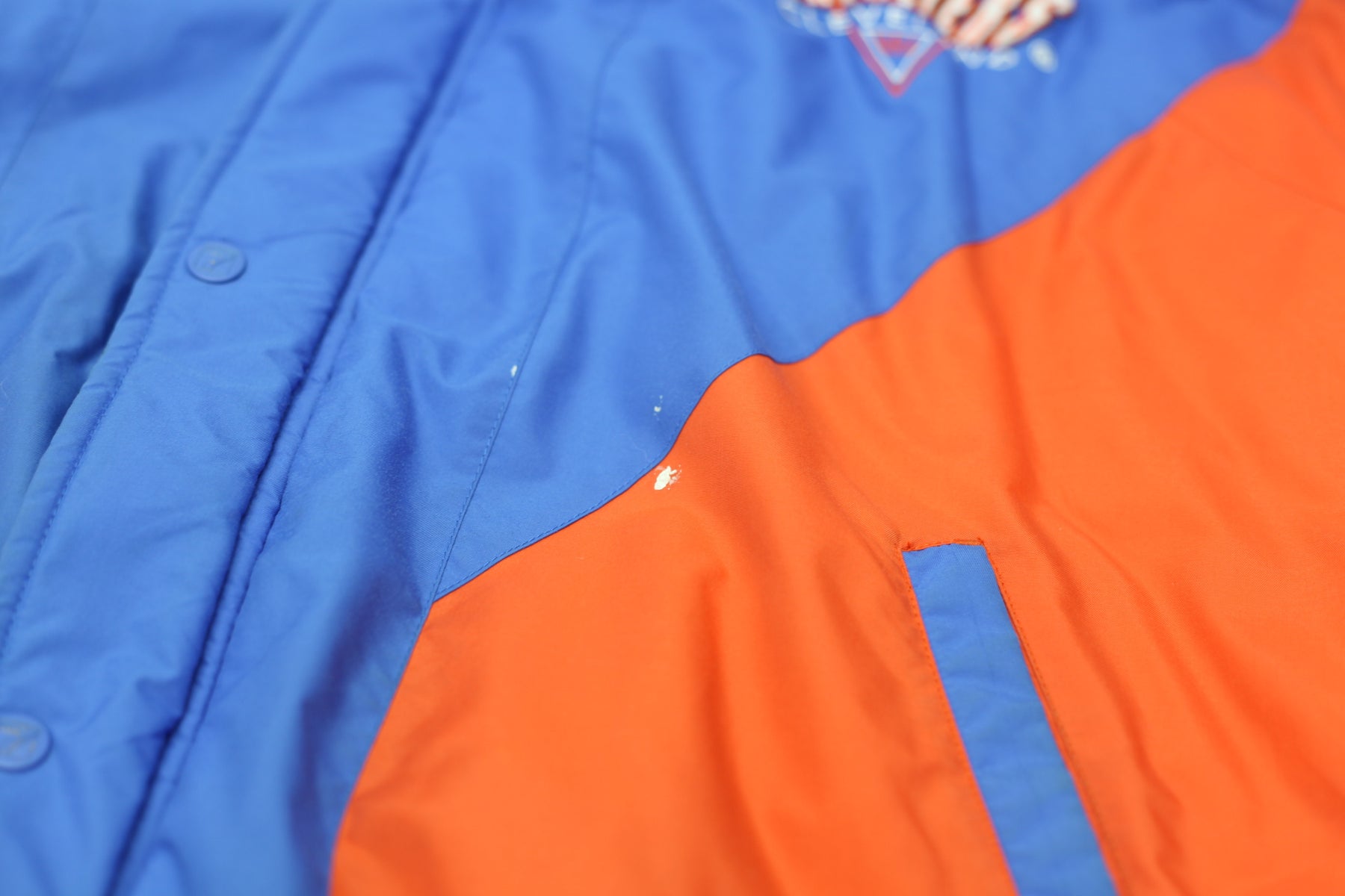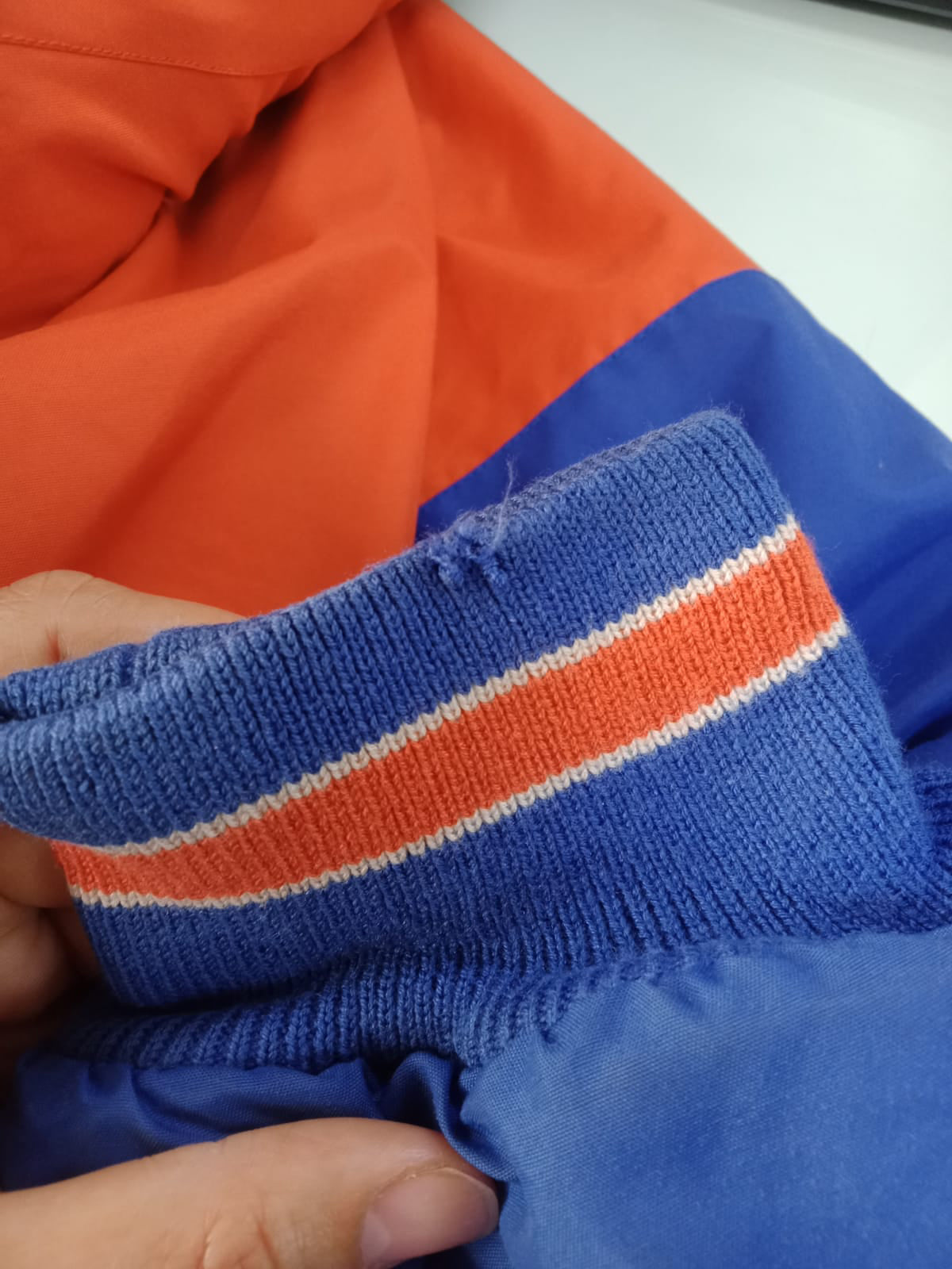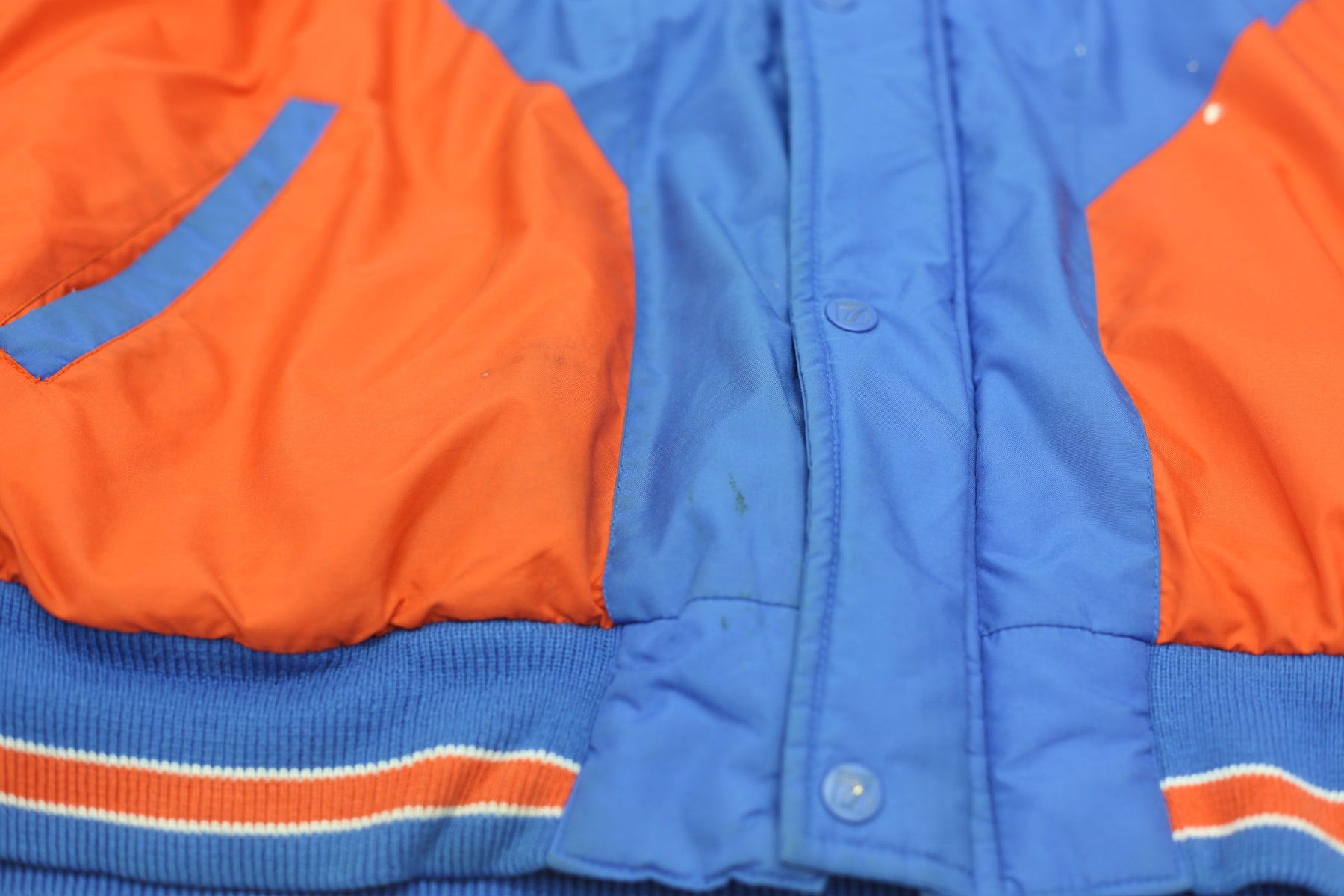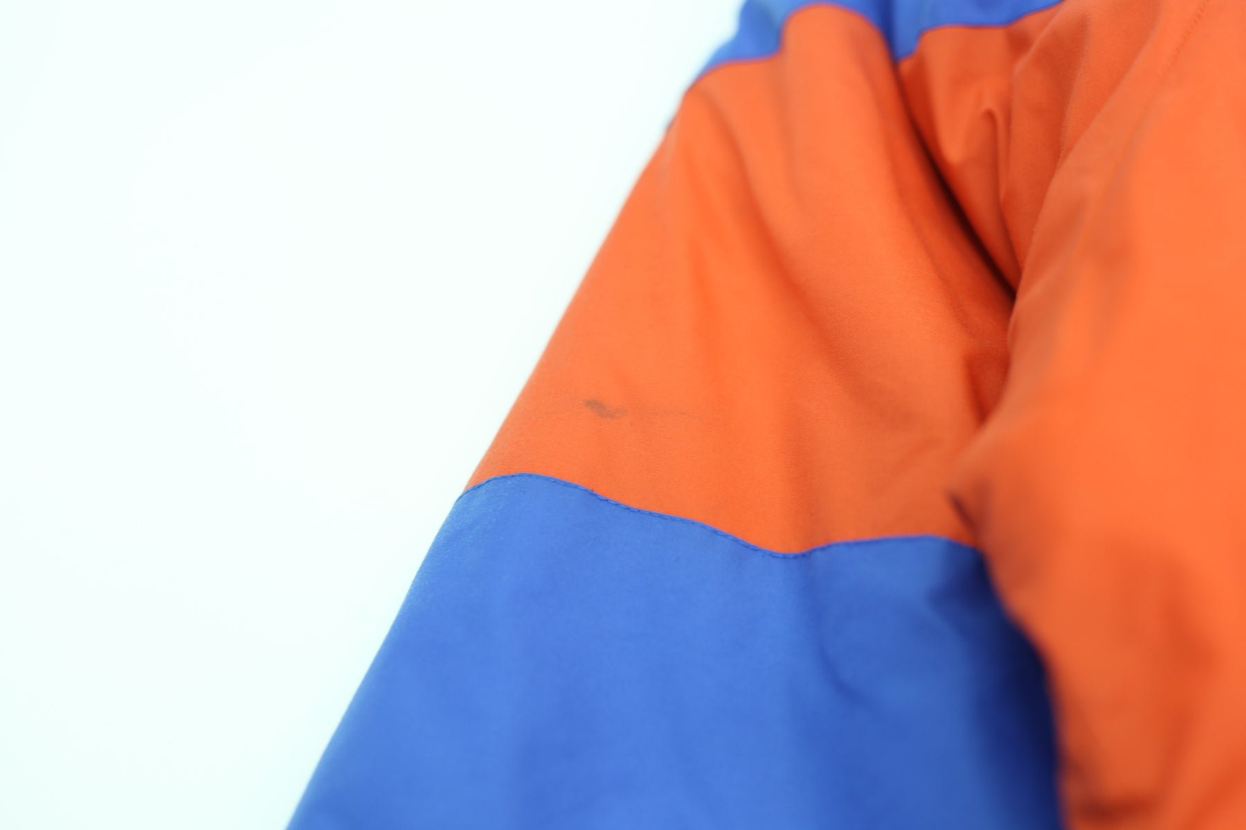 Stain on bottom sleeves & hood. Small ripped on sleeve cuff