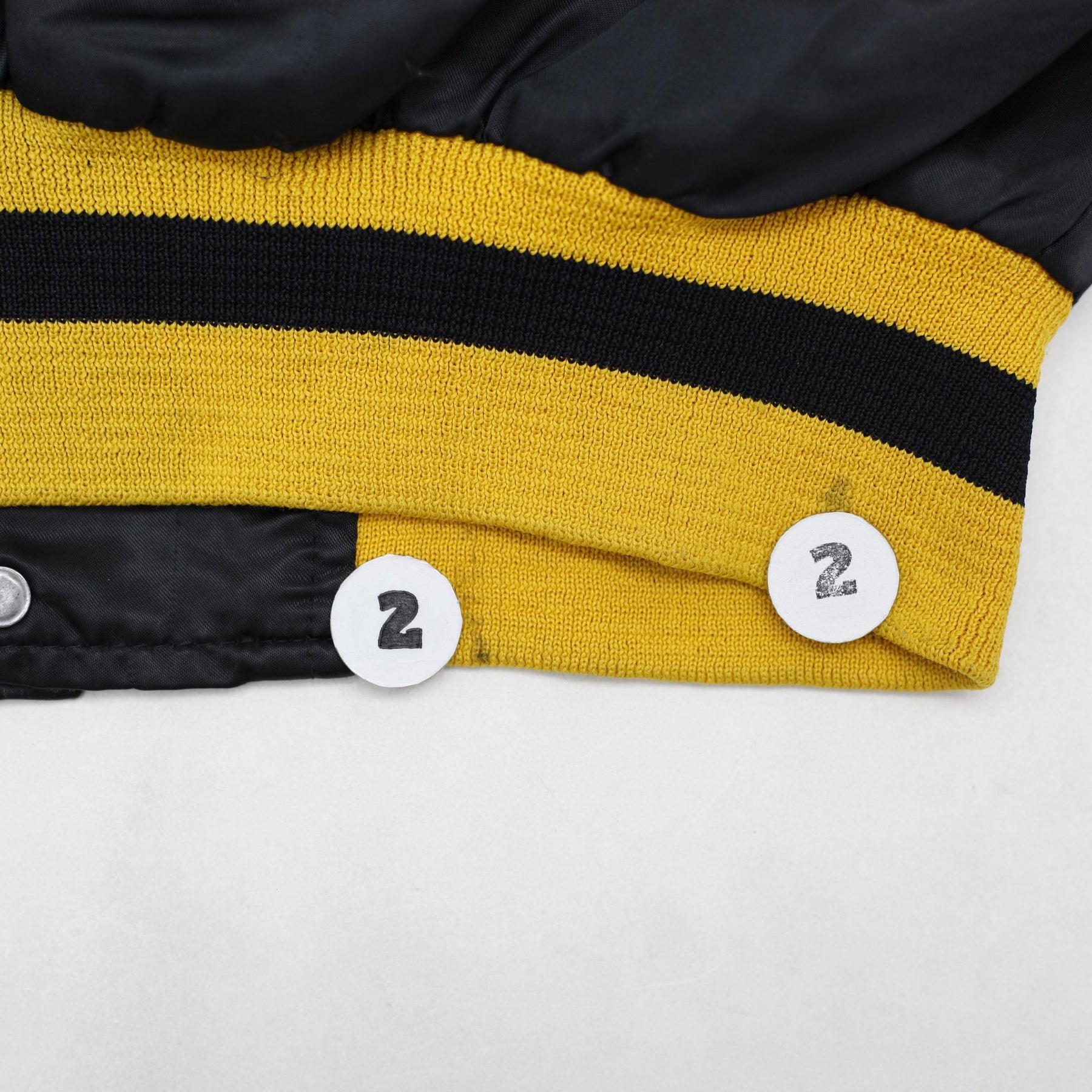 1. Pulling thread on sleeve; 2. small stain on bottom elastic