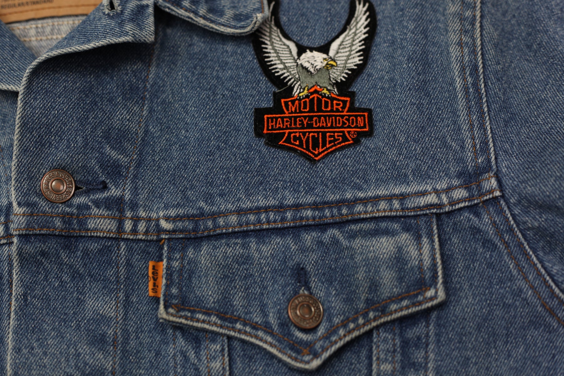 Vintage Levi Strauss 75515-0212 Orange Tab Harley Davidson Patched Denim Jacket