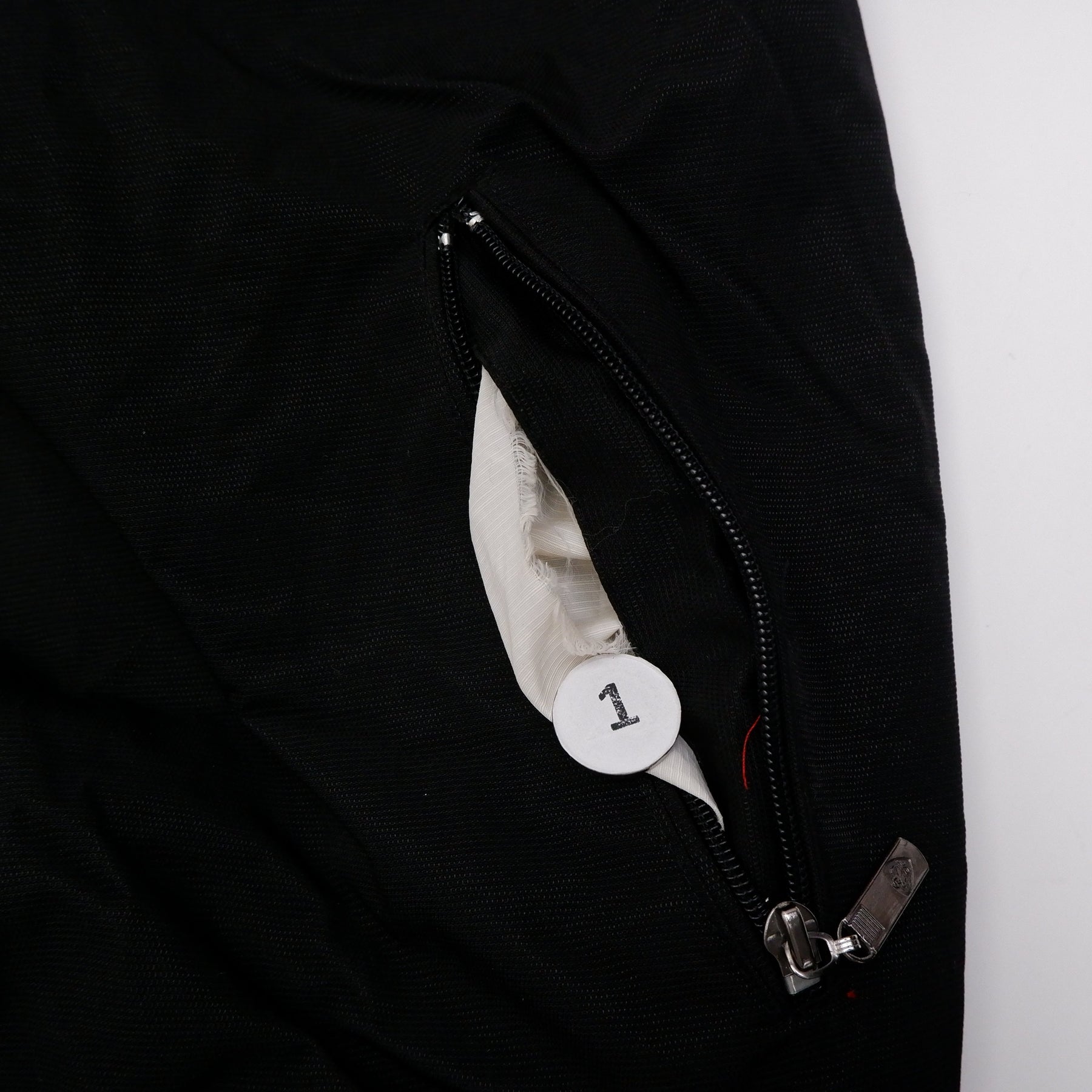 1.left pocket tear 2.small dotted stain on left sleeve 3-4.Pink stain on right sleeve
